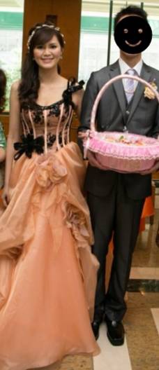 送客禮服是粉橘色黑色亮面裝飾的甜美搖滾風,也是我媽選的,不過拿禮服試穿的時候,禮服狀況維持的也不是很好。