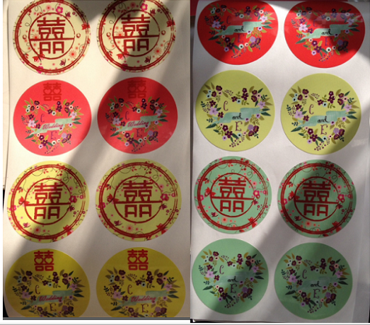 順便利用圖檔,再變化出八款貼紙,印了一個5X5的規格最小批量,打算在喜帖跟婚禮上布置可以用)